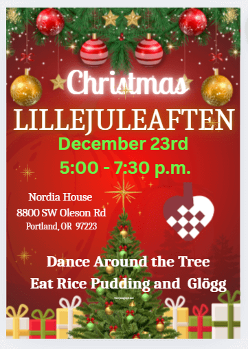 For many years (at least 40!), Danes in Oregon and Southwest Washington have gathered each year on December 23 to celebrate Christmas in the traditional Danish way. The Lillejuleaften (“Little Christmas Eve”) event in Portland features a Danish church service and a kaffebord (coffee and cake). Come wish everyone a glædelig jul!